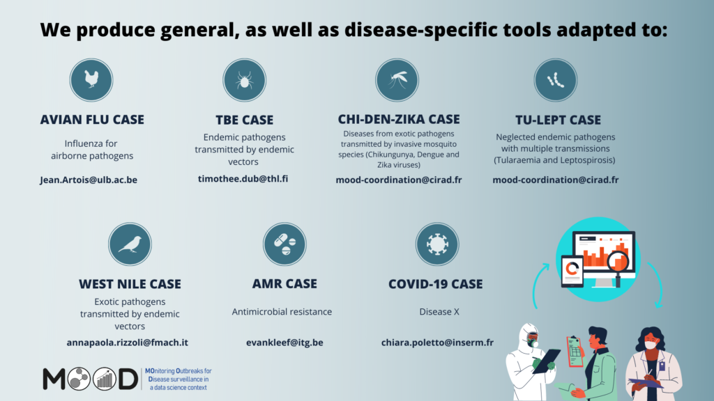 The MOOD project is collaborating with national and international Public and Veterinary Health agencies in Europe (end-users) to enhance their Epidemic Intelligence capacity through currently five study cases on airborne, vector-borne, multiple transmission routes diseases, including AMR and disease X.