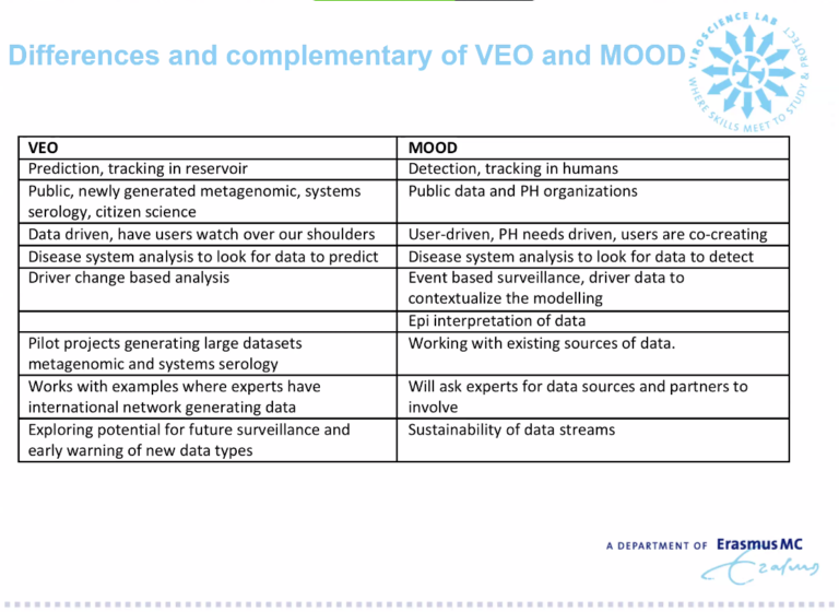 The MOOD project is collaborating closely with the VEO H2020 project. We share many objectives while being different in the sense that MOOD is more focused on user perspective and tracking and understanding outbreaks after they happened, while VEO focuses on outbreaks before they happen.
